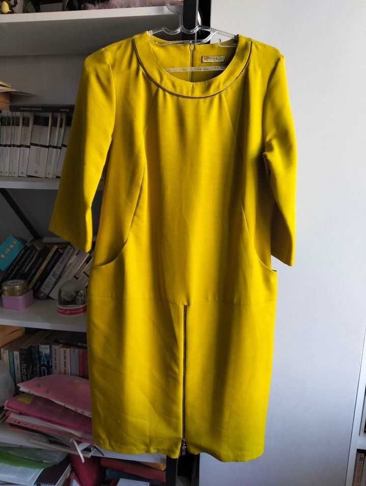 midi elbise. önden fermuar süslemeleri var. ölçüleri fotoğraflarda var. koyu sarı. fakir kol kesim. sıfır kullanılmamış.