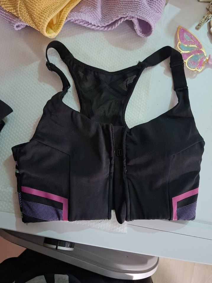 Önden fermuarlı, ayarlanabilir askılı siyah spor sütyeni. Yanlarda mor detaylar ve nefes alabilen file sırt kısmı bulunur.