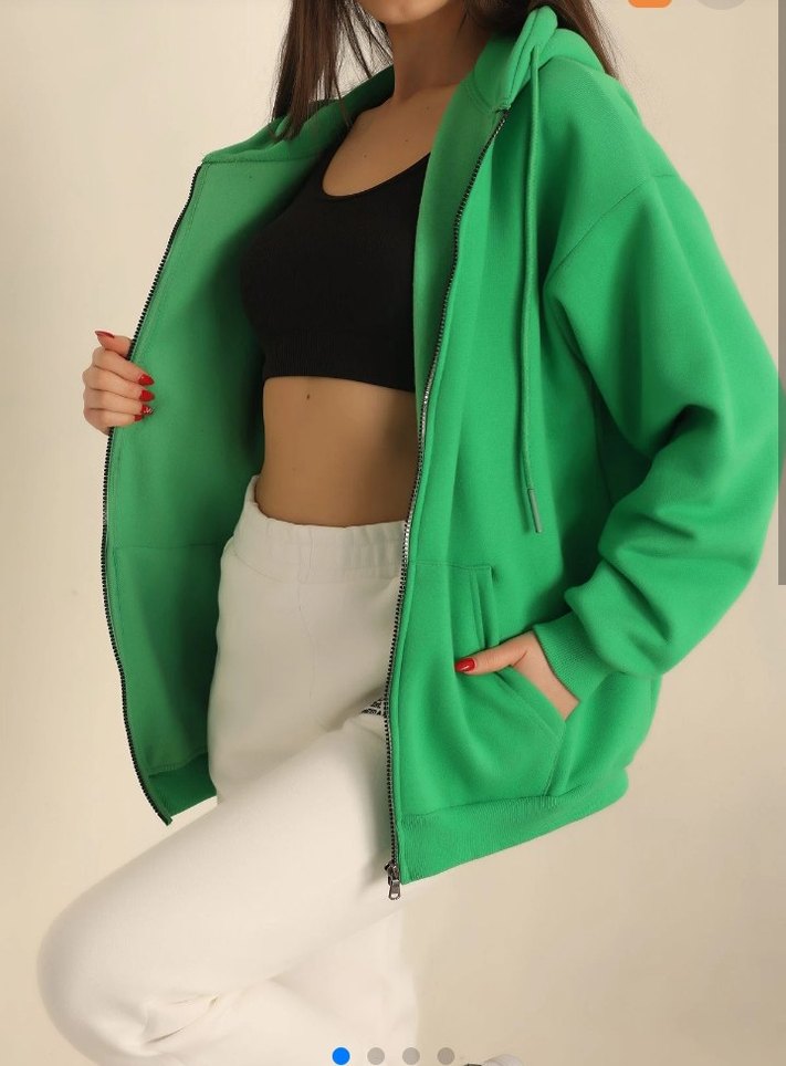 Kadınlar için önden fermuarlı, uzun kollu ve yuvarlak yaka, bol kesim yeşil sweatshirt. Yumuşak ve sıcak kumaştan, günlük kullanım için uygun.
