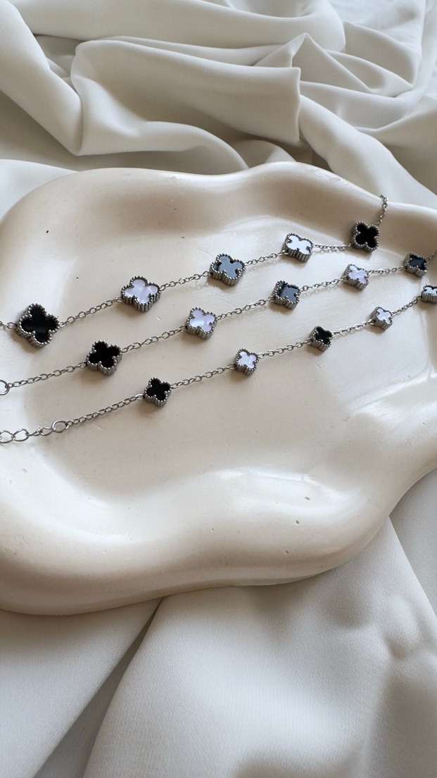 Gri ve beyaz işlemeli yonca desenlerine sahip zincir detaylı çağdaş kadın bileklik, günlük kullanıma uygundur.