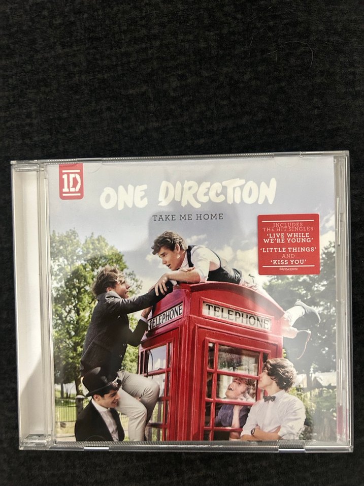 One Direction'un 'Take Me Home' CD albümü, kırmızı telefon kulübesi önünde grup üyelerini gösterir. 'Live While We're Young' ve 'Little Things' gibi hit şarkılar içerir .