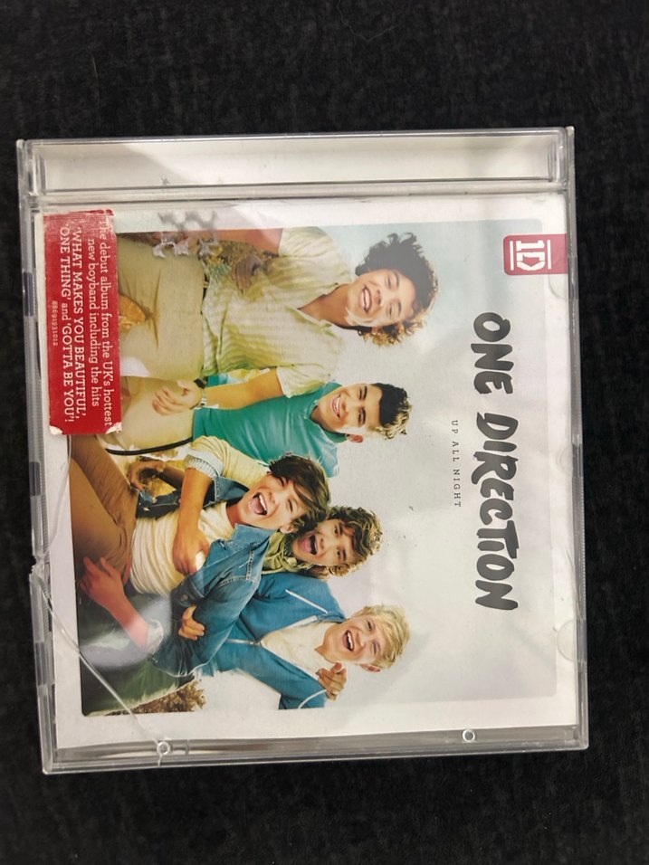 One Direction'ın 'Up All Night' CD albümü, çıkış şarkılarını içerir. Kapakta kırıklar var, son iki görselde görebilirsiniz.