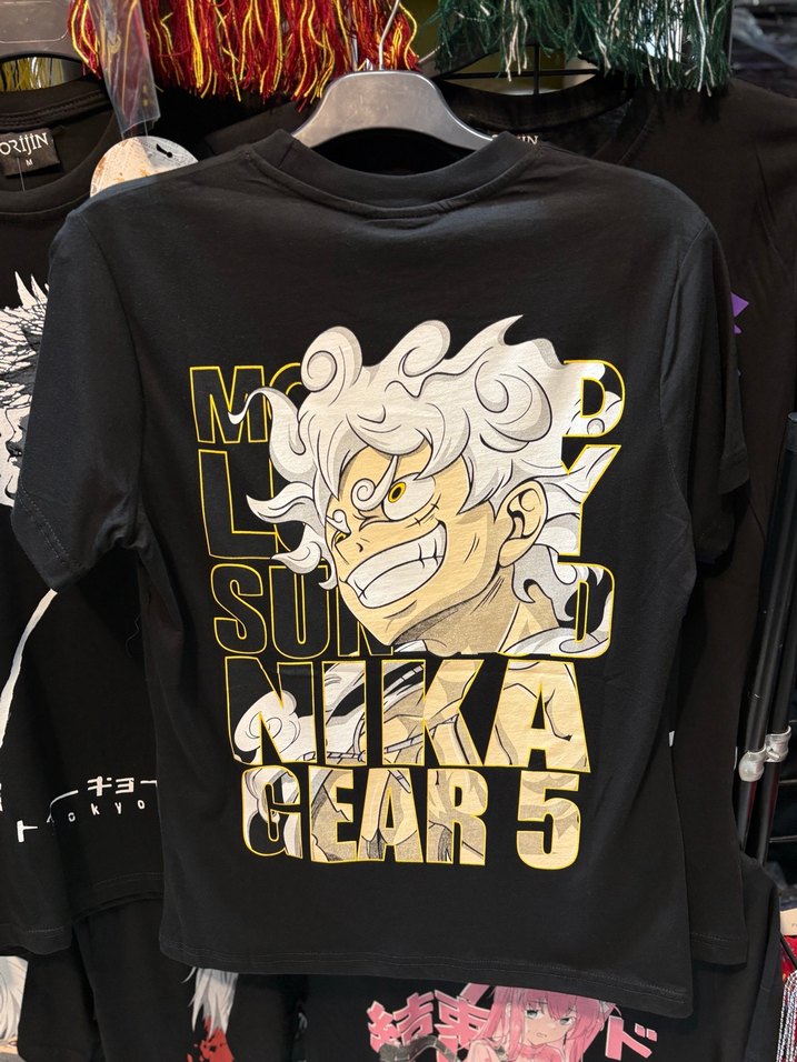 Bedenler mevcut Siyah, parlak baskılı anime deseniyle bol kesim, kısa kollu, bisiklet yaka tişört. Sokak stiline uygun.