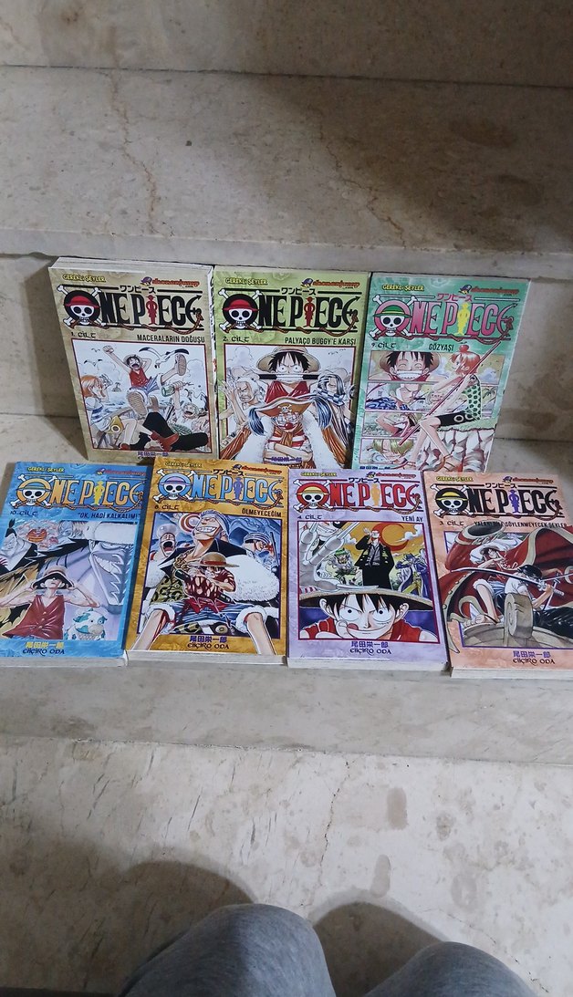 One Piece çizgi romanlarından oluşan 7 ciltlik set. Her kitapta renkli kapak ve detaylı çizimler bulunur.