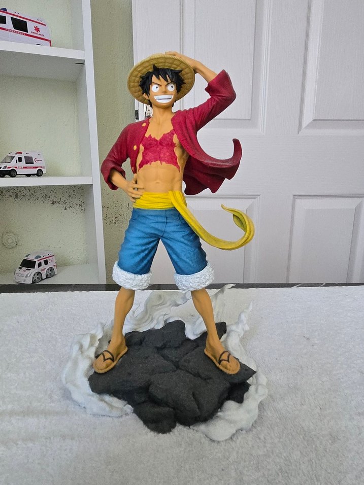 Renkli giysileri ve şapkasıyla kayalık bir zeminde duran One Piece Luffy aksiyon figürü. Koleksiyoncular için uygundur. ☠️