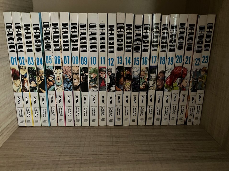 One Punch Man manga serisinin 1'den 23'e kadar ciltleri, renkli kapaklar ve temiz durumda