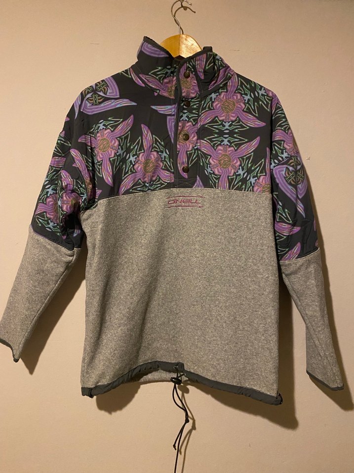 Yurt dışından geldi, Yüksek yakalı ve uzun kollu, bol kesim erkek sweatshirt. Alt kısmı gri yumuşak kumaş, üst kısmı mor ve siyah desenli, fermuar ve ayarlanabilir ip detaylı. Günlük ve sokak stili için uygun.