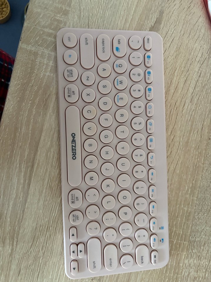 Yuvarlak tuşlara sahip ONEZERO pastel beyaz klavye, kompakt tasarımı ve yumuşak görünümüyle dikkat çekiyor. ⌨️ bluetooth klavye. Pilli.