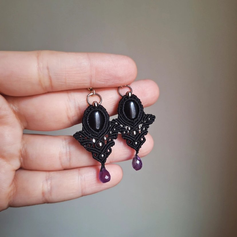 Ucunda ametist kristal boncukla süslenmiş Oniks küpeler. Küpe kancası 925 ayar gümüştür.