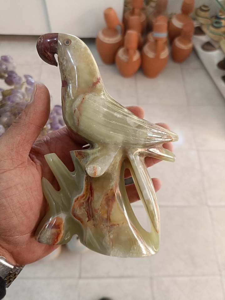 Hafif haki renkte, doğal taştan oyulmuş papağan figürü. Detaylı işçilik ve pürüzsüz dokusu ile dekorasyona farklılık katar.