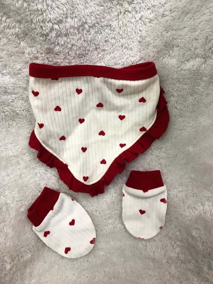 Örgü, beyaz zemin üzerinde renkli kırmızı nakış kalplerle bebek kız hastane seti. Eldiven ve fırfırlı önlük içerir. ❤️