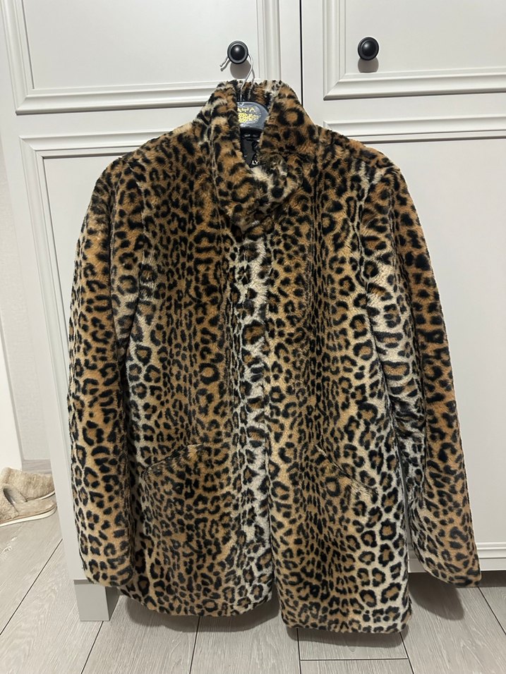 Leopar desenli, suni kürk kumaştan yapılmış, notched lapel yaka ve uzun kollu, Rahat ve günlük kullanıma uygun