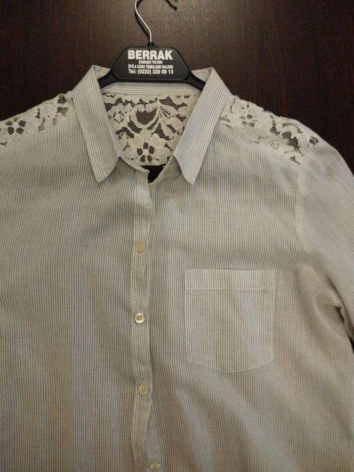 Çizgili, pamuklu, dantel detaylı, yakalı ve düğmeli kadın gömleği. Önünde cep bulunur. only markasıdır. 36 beden. Kumaşı ince müslim gibi yumuşacık. Tertemiz defosuz sayılı kıllanıldı. Jean veya kumaş pantolonla şık kombinler yapılabilir. %100 pamuklu kumaş.
