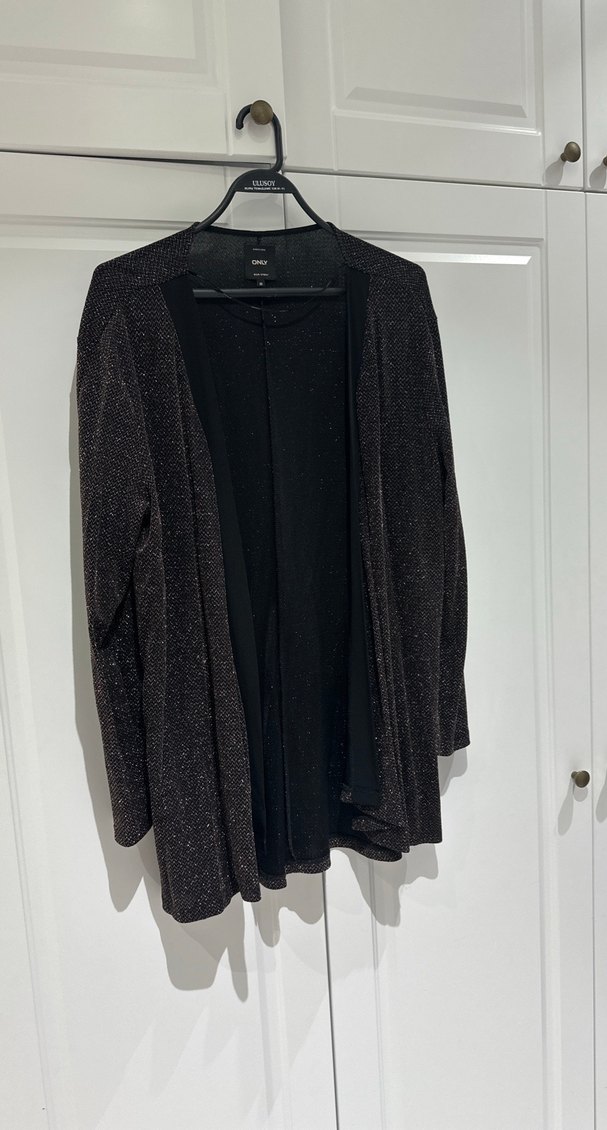 Siyah kadın hırka, salaş kesim, yumuşak sentetik kumaştan üretilmiştir. Uzun kollu, drapeli ve kesik yakalıdır, ofis kullanımı için uygundur. Hiç giyilmedi. Parlak kumaş