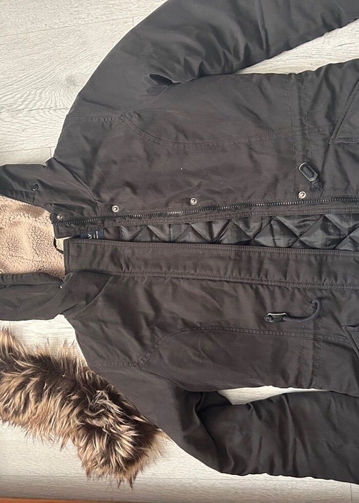 Bir kış giyilmiş sadece şapkasında minik bir sigara yanığı var başka da bir sorunu yok fermuarlı çıtçıtlı uzun kullanışlı çok da sıcak tutuyor