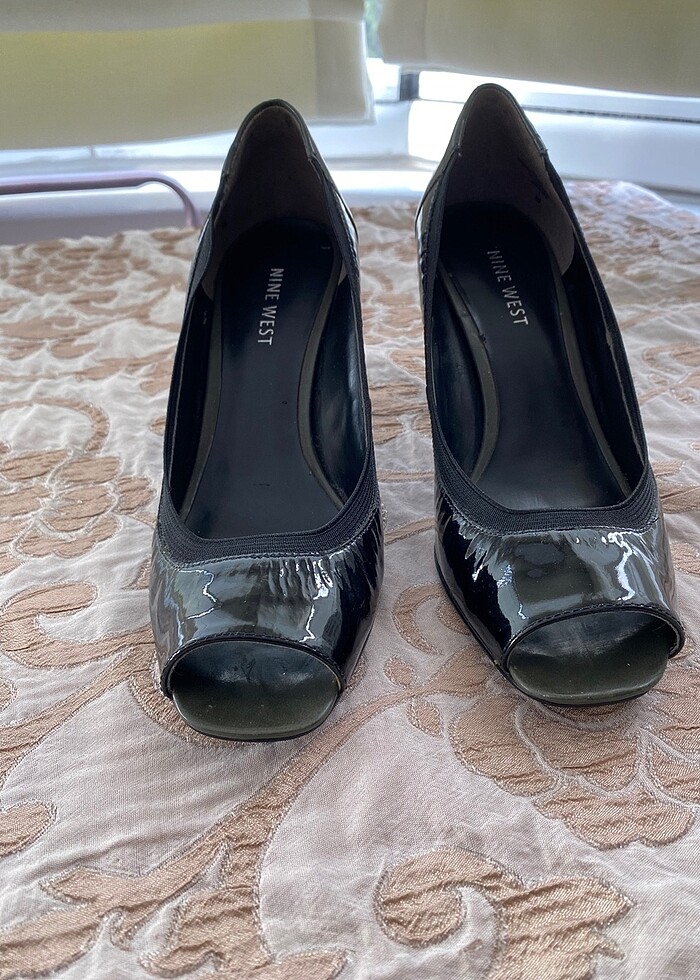 Önü açık rugan kalın topuklu ayakkabı rengi siyah arka topuk kısmı haki renginde numarası 36.5 nine west ayakkabı kalıpları biraz geniştir kalın topuklu olduğu için rahat ayakkabı çok az kullandım topuğundan belli oluyor topuk boyu 7.5 cm