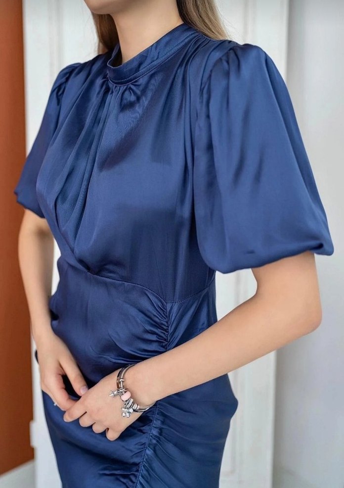 Parlak lacivert renkte, kısa kollu, yüksek yakalı ve drapeli tasarıma sahip, saten dokulu, klasik şıklıkta midi elbise.