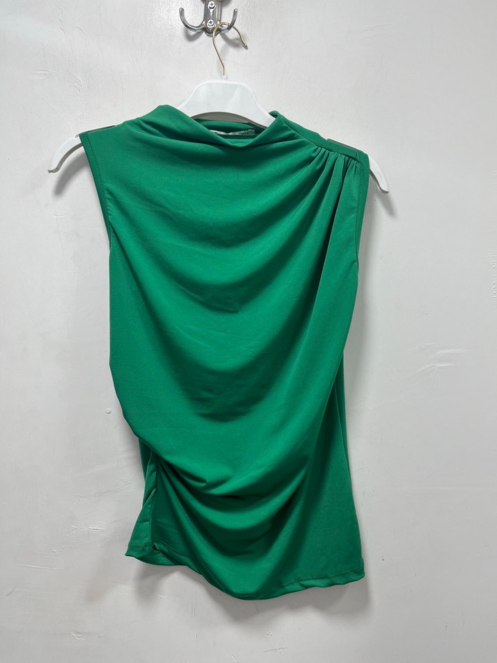 Yeşil renkli, drapeli detaylı, yüksek yakalı ve kolsuz bu bluz, modern ve minimal bir tarz sunar.