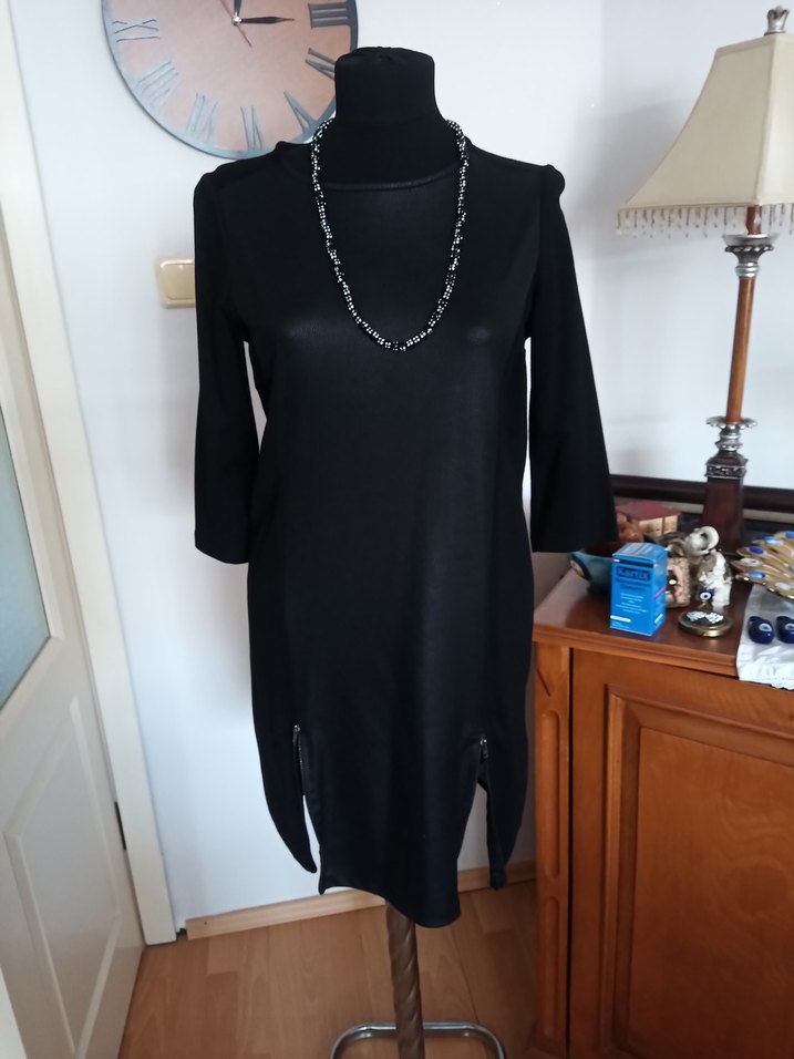 Siyah yılan derisi görünümlü,3/4 kollu, ön yanlar fermuarlı yırtmaçlı,gotik tarzda koltuk altları arası 46, uzunluğu 86 cm.S/M