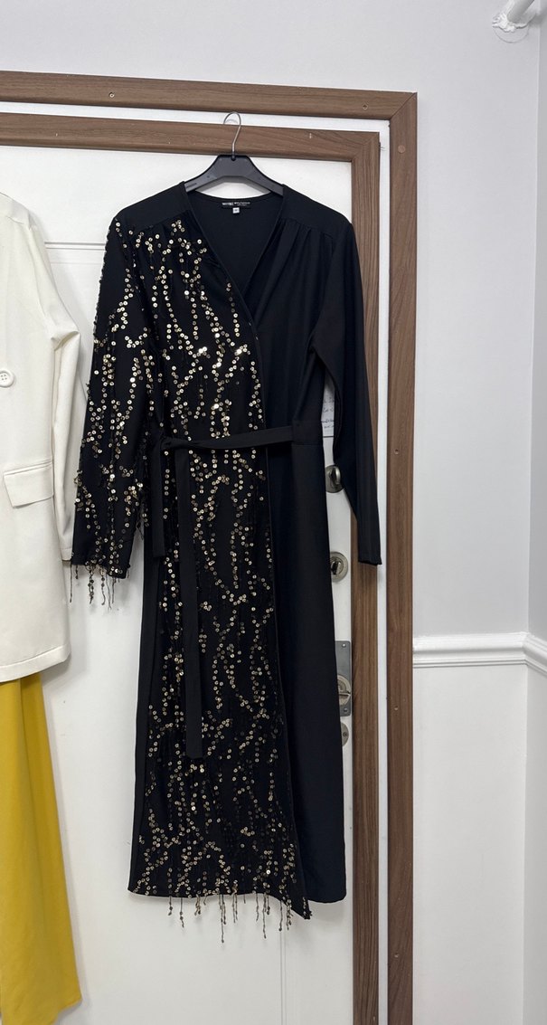 Siyah uzun elbise, drapeli ve desenli ön yüzü, uzun kollu ve yakası kesik yakalıdır. Sentetik kumaştan yapılmış, günlük kullanıma uygun modern avangard tarzda, normal kesimdir. ✨