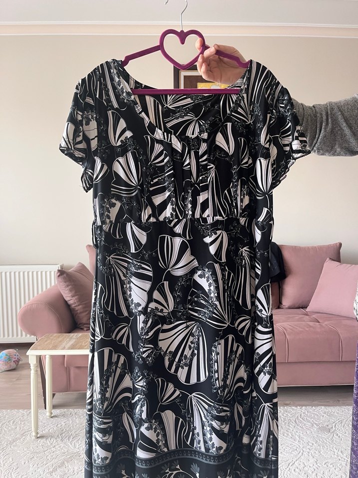 Siyah beyaz bağlama desenli hamile tunik, yumuşak sentetik kumaş, drapeli ve V yakalı, kısa kollu, bol kesim ve midi boyda, günlük kullanıma uygun.