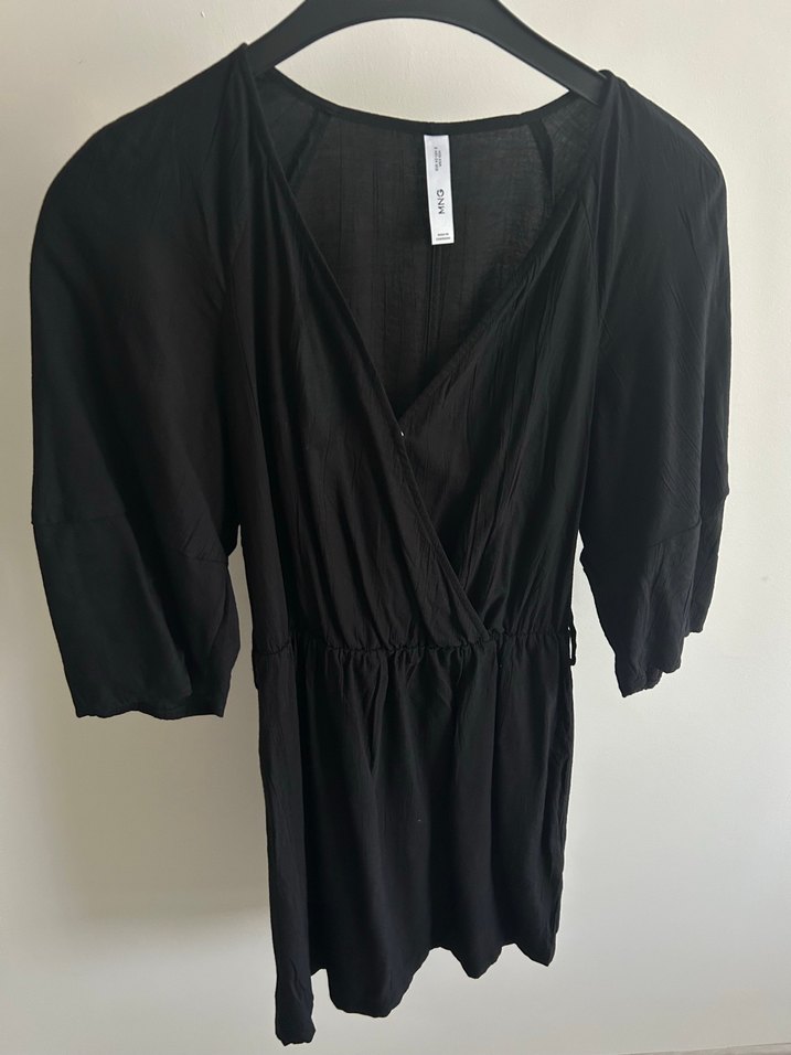 Önü Drapeli Siyah Mango marka Keten kumaş elbise kısa kol