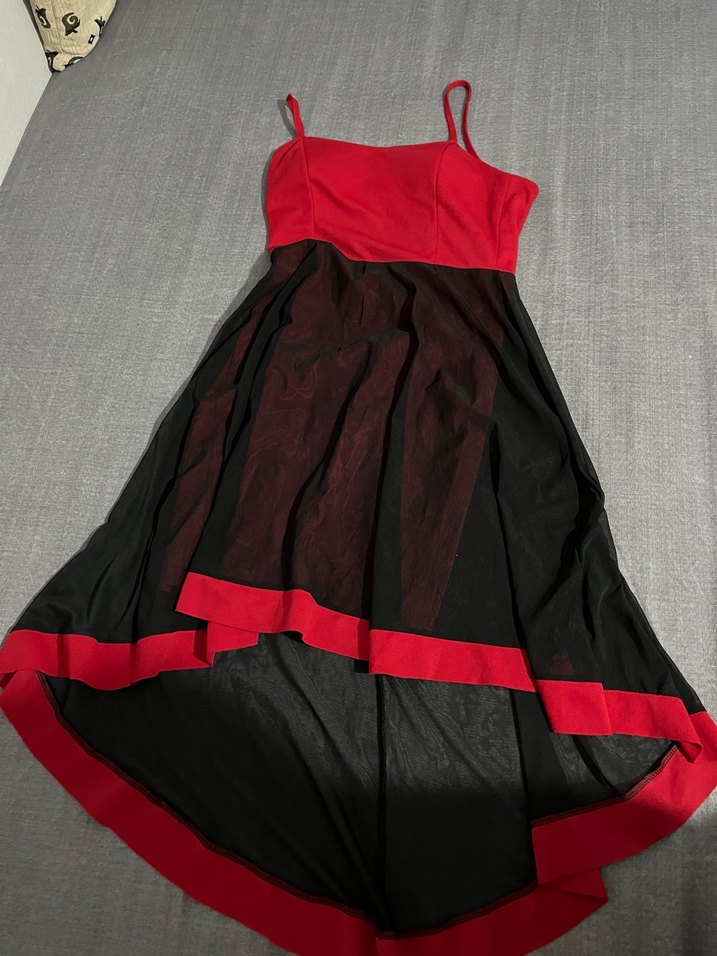 İçi dar kalem elbise dışından tül ile önü kıssa arkası uzun kırmızı bi elbise Hasarı hiç bir şekilde yok bi kere kullanıldı temiz
