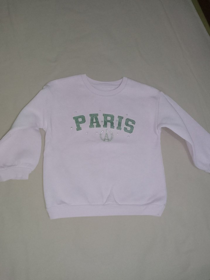 Yuvarlak yaka, uzun kollu, bol kesim beyaz sweatshirt. Önünde pastel yeşil "PARIS" baskısı bulunur. Kısa boy, yumuşak ve sıcak kumaştan üretilmiştir.