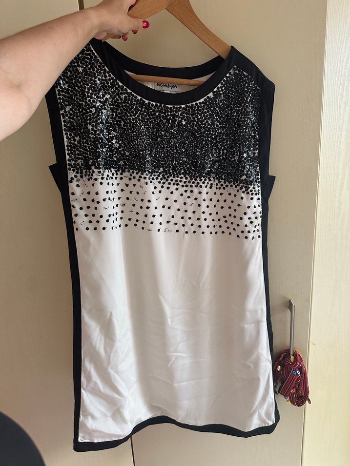 Önü Payetli Beyaz Siyah Detaylı Bluz