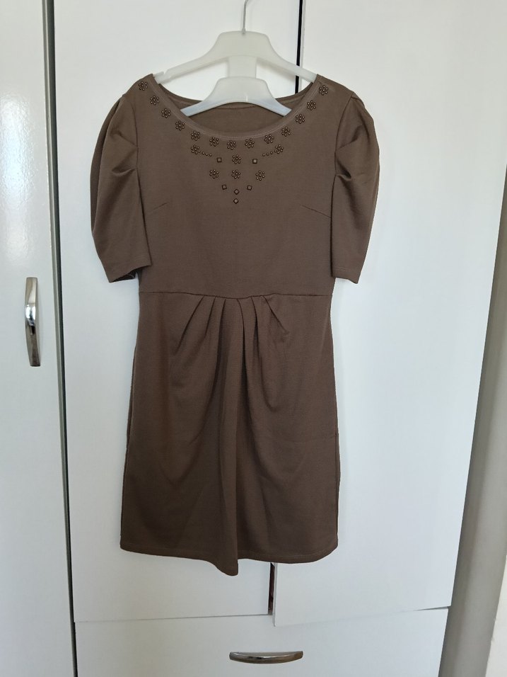 Önü taşlı kısa karpuz kollu, bej midi penye kumaş elbise. Salaş kesim ve bohem tarzıyla günlük kullanıma uygundur. Ölçüler bel 37 koltukaltı 44 uzunluk 83