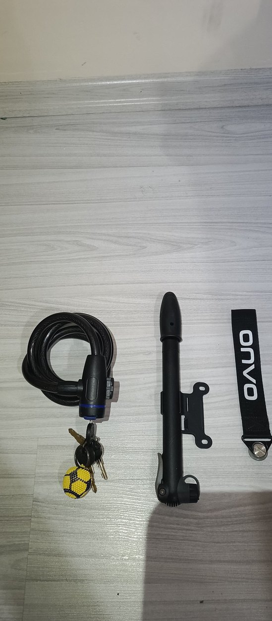 Anahtarlı siyah kilit kablosu ve kompakt pompadan oluşan Onvo marka set. Bisiklet güvenliği için uygundur. sıfır sadece kilitin 1000 liraya Aşkın Ben üçünü o fiyata veriyorum böyle set bulamazsınız pompa ufak cep pompası diye geçer