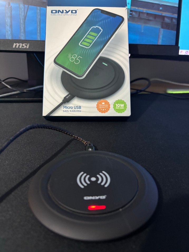 Onyo kablosuz şarj cihazı, siyah renkte Micro USB bağlantısı ve 10W hızlı şarj özelliği sunar. Kablosuz şarj destekleyen cihazlarla uyumludur. ⚡
