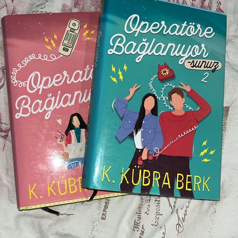 K. Kübra Ber'in "Operatör Bağlanıyor" adlı iki romanı. Kapaklarda çizimli karakterler ve eski telefonlar yer alıyor.