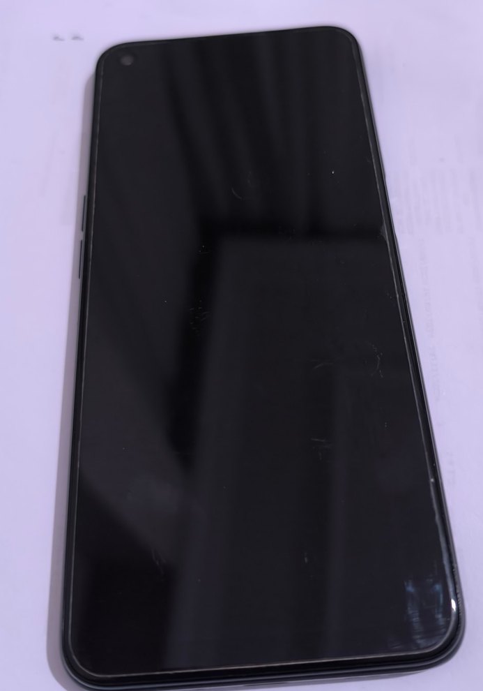 Koyu ekranlı siyah Android telefon, ince tasarımlı ve yan tarafında düğmeler bulunur. Ekranın köşesinde ön kamera vardır. 128 gb