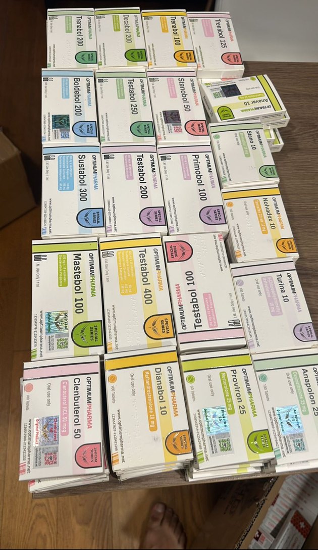 Optimum Pharma markalı Dianabol, Clenbuterol, Primobol, Testabol, Sustabol ve diğer steroid kutularından oluşan set.