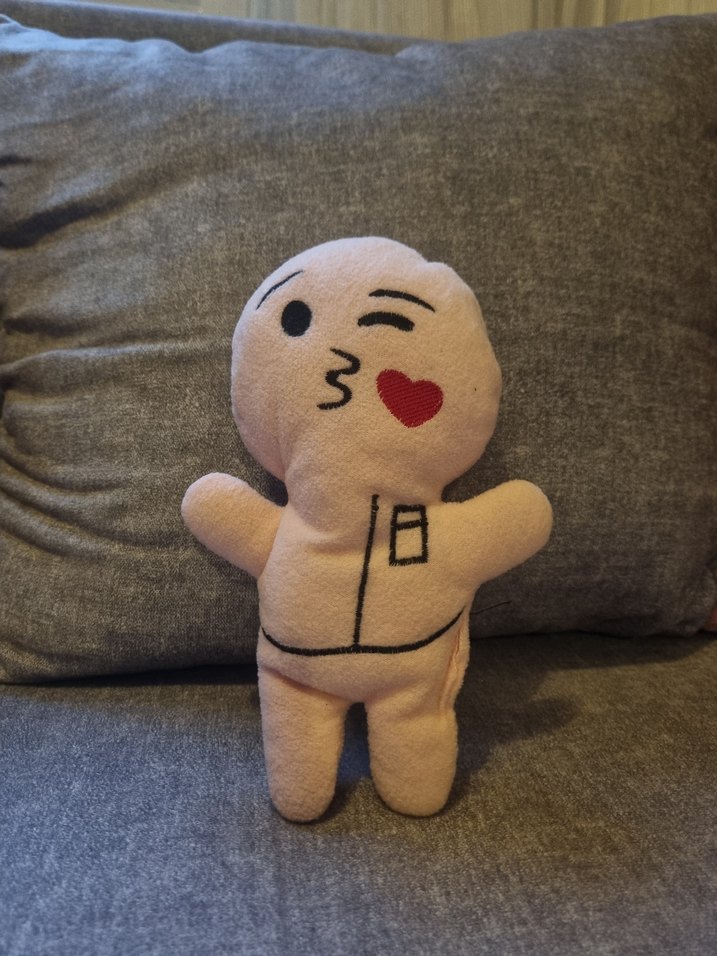 Bej renkte ve pastel tonlarda peluş oyuncak, yanak kısmında kalp detayı ve göz kırpan sevimli yüz ifadesiyle yumuşak dokulu.