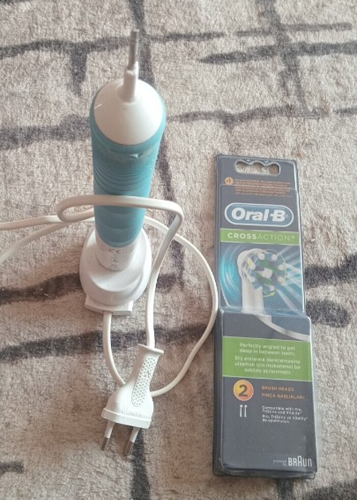 Oral-B crossaction dış fırçası,şarj standı ve 2adet açılmamış fırça başlığı. Fırça ve şarj standı 4-5 defa kullanıldı,sıfır değerinde..