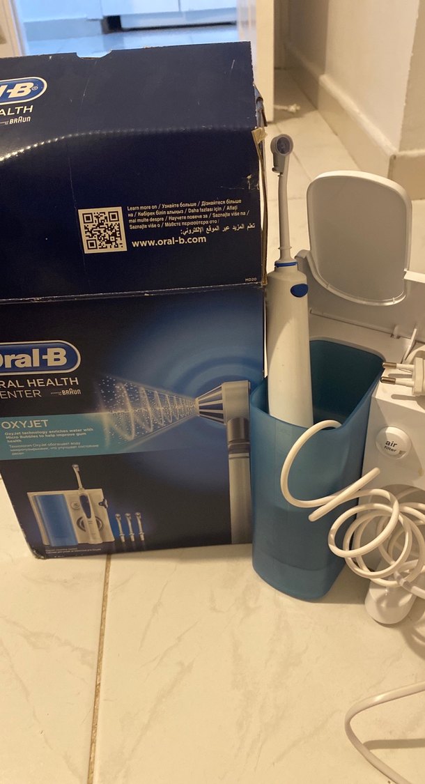 Oral-B Oxyjet cihazı, su jeti teknolojisi ile etkili ağız bakımı sağlar. Mavi renkte, yedek başlık da var