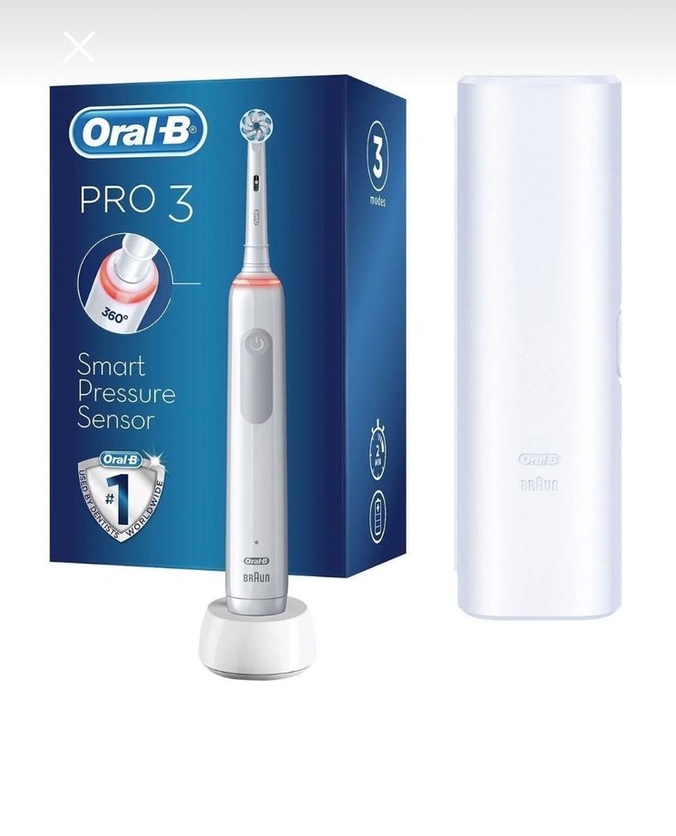 Oral-B PRO 3 elektrikli diş fırçası, akıllı basınç sensörü ile diş etlerini korur. Beyaz ve gri renklerde şarj standı ve seyahat kutusu ile birlikte gelir.