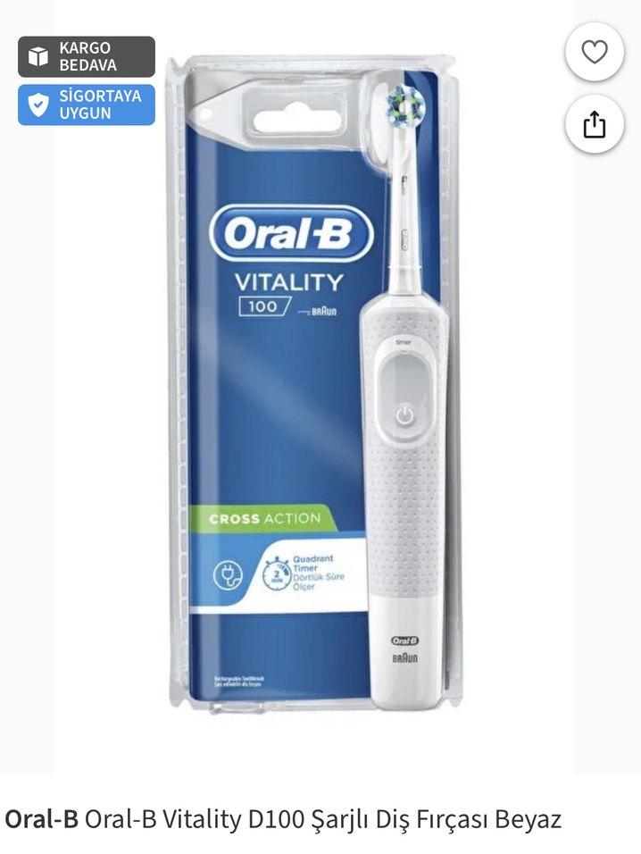Oral-B Vitality D100 şarjlı beyaz diş fırçası, CrossAction başlığı ve zamanlayıcı ile etkili temizlik sağlar. ⚪ SIFIR ÜRÜNDÜR JELATİNLİ AMBALAJLI ÜRÜNDÜR İADE YOKTUR