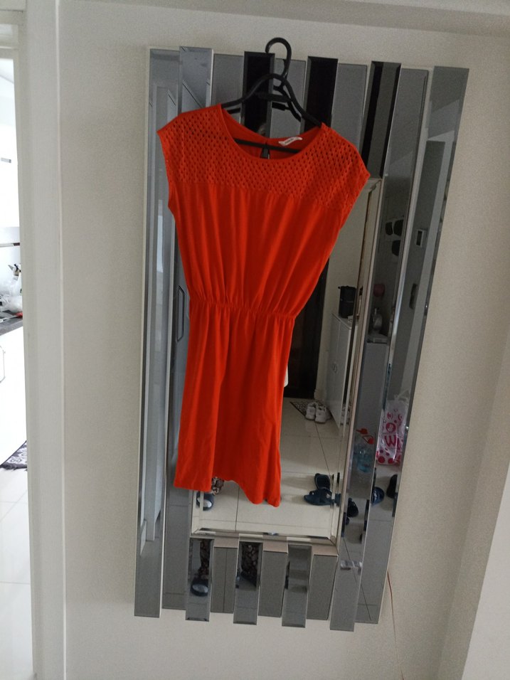 turuncu, kolsuz, belden lastiklive bisiklet yaka detaylı, vücuda oturan midi elbise. Sentetik kumaştan üretilmiş, günlük sokak stiline uygun canlı renkli model. renk çok tatlı xs s vem uyumlu