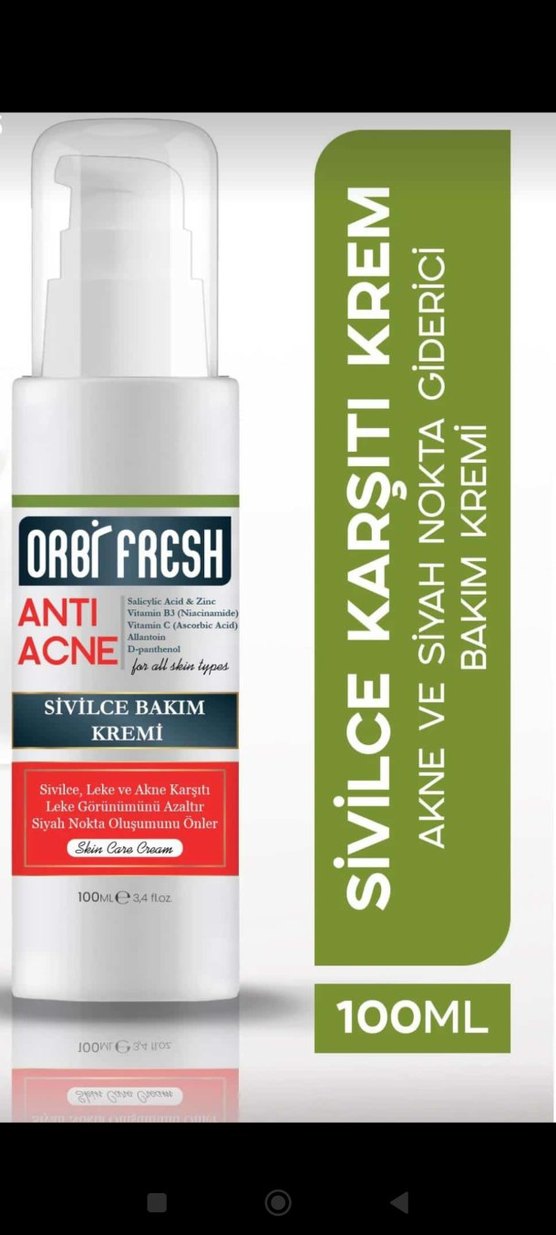 Orbi Fresh Anti Akne krem, sivilce, leke ve siyah nokta görünümünü azaltır. Salisilik asit, çinko, B3 ve C vitamini ile cilt bakımına destek olur. Tüm cilt tipleri için uygundur.