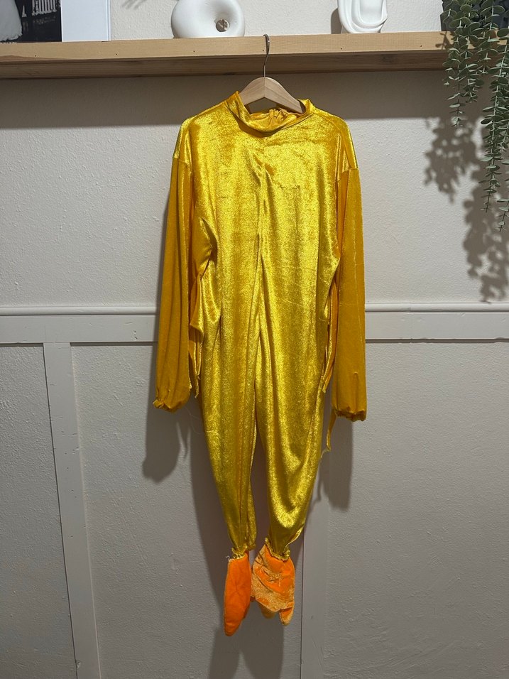 Parlak sarı renkli Ördek kostümü 6/7 yaşa uygundur