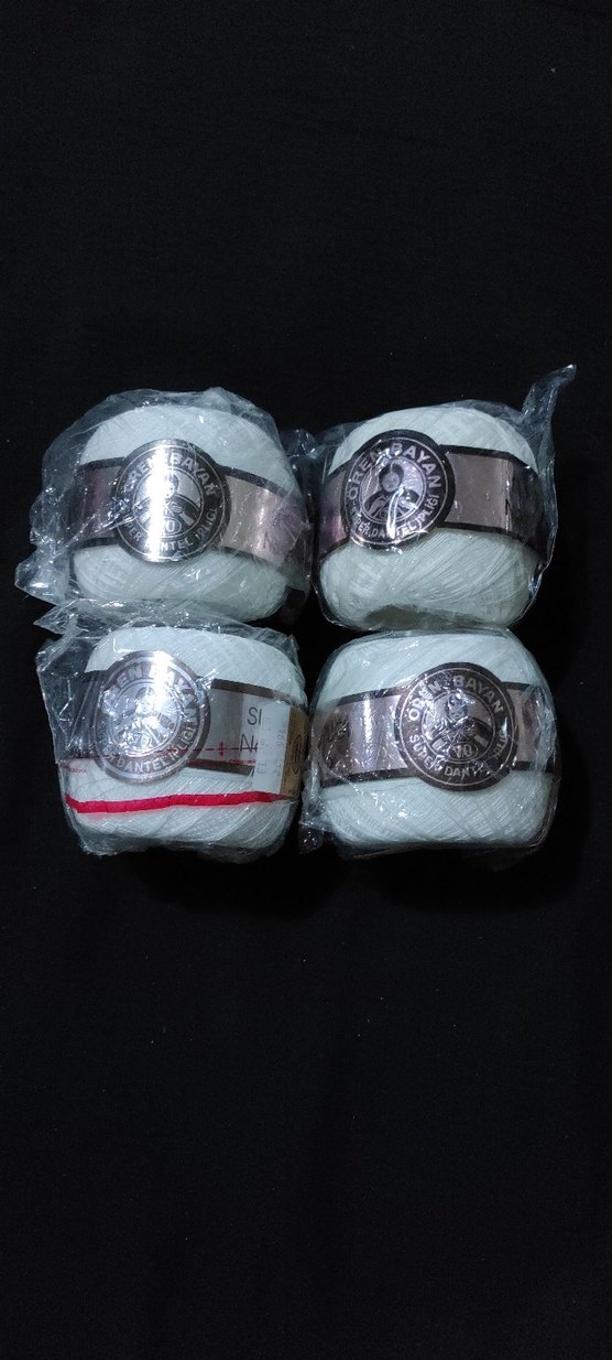 Dört adet beyaz örgü ipi topu, her biri ayrı plastik ambalajda. El işleri için uygundur. Ören Bayan 70 numara dantel ipleri hiç biri 100 Gr toplu fiyattır