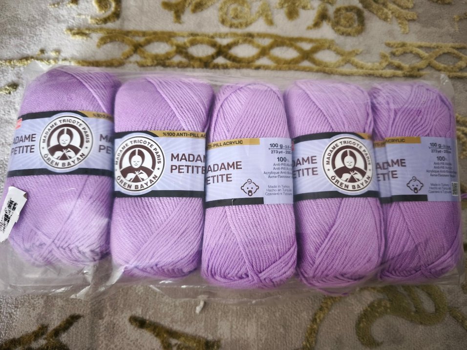 Pastel mor renkte, etiketli yün iplik seti. Yumuşak ve tüylenmeye karşı dayanıklı, 100 gram ağırlığında iplikler içerir. adet fiyatı dır