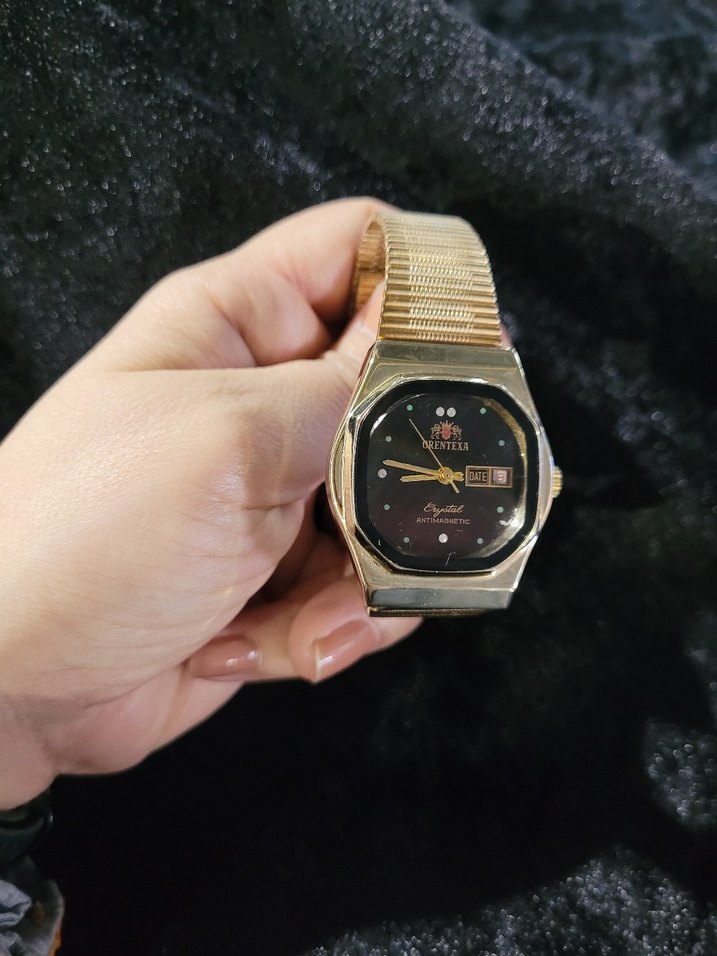 Orentexa altın kaplama, siyah kadran, tek pencere takvim göstergeli kurmalı kol saati Kullanılmamış yepyeni kurmalı saat. Farkli kadran renk secenekleri mevcuttur. Pratik kullanımda veya ayar yaparken 24 saat çevirince takvimi değişir. ⌚