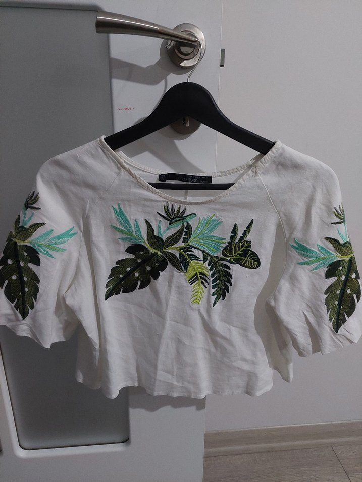 orfeonegro bluz. bohem tarzda, kısa kollu, düğmeli ve yaprak desenli beyaz bol kesim crop bluz. ölçüler fotograflarsa var.