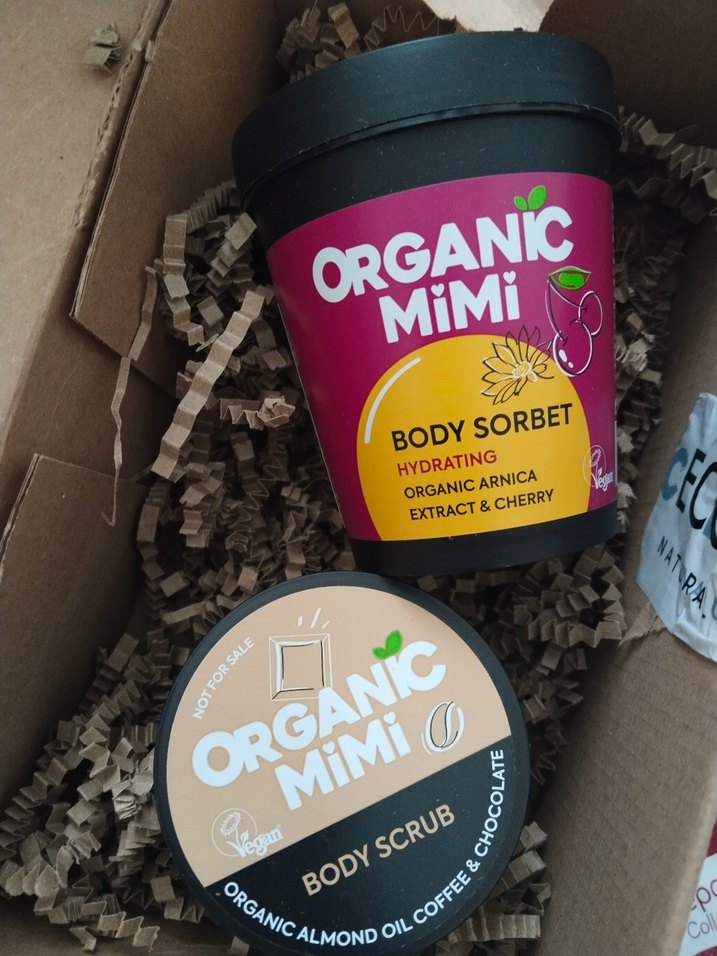 Organic Mimi vücut peelingi badem yağı, kahve ve çikolata içerir. Vücut sorbesi organik arnika özü ve kiraz ile nemlendirir. İkisi de vegan. 2li fiyatıdır