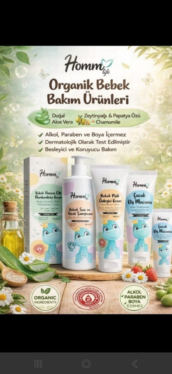 Zeytinyağı, papatya ve aloe vera içeren organik bebek bakım ürünleri seti. Alkol, paraben ve boya içermez, dermatolojik olarak test edilmiştir. Besleyici ve koruyucu bakım sağlar.