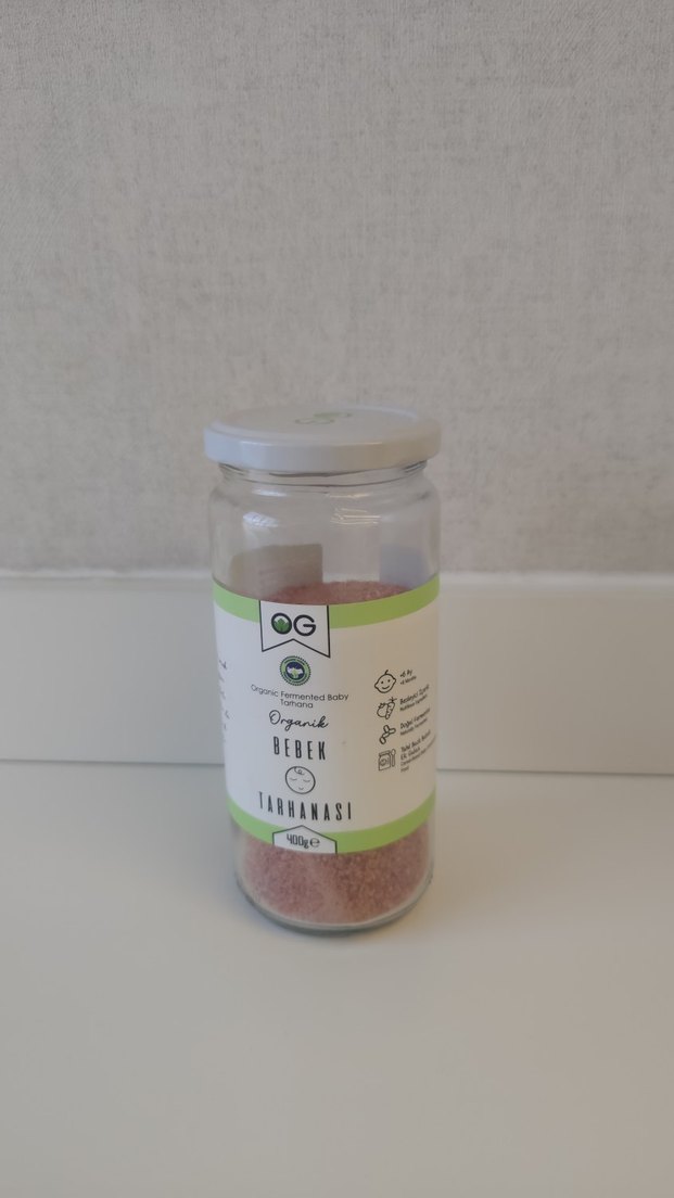 400g organik bebek tarhanası, açık bej renkli toz halinde. "BEBER" etiketiyle cam kavanozda, beyaz kapaklıdır.